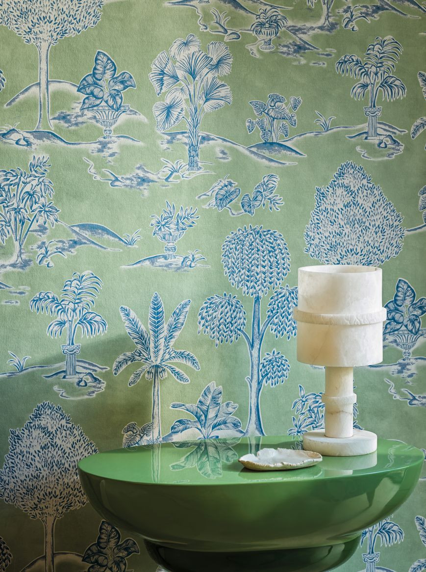 Karuna tapet fra Osborne & Little - Denne tapeten gjenskaper en klassisk toile med påvirkninger fra greske prydhager, med dekorative søyler og skulpturer.