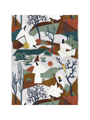 Symphonia gardinstoff fra Osborne and Little - Et helt unikt tekstildesign med brodert mønster av musikere i et fredfullt landskap. Merk at dette tekstilet selges i paneler med bredde 127cm, og anvendbar høyde 335cm. Den totale panelhøyden er 395, da det er lagt til 30cm stoff for sømmonn i topp og bunn. Merk også at de mørke kantene på interiørbildet ikke er en del av designet.